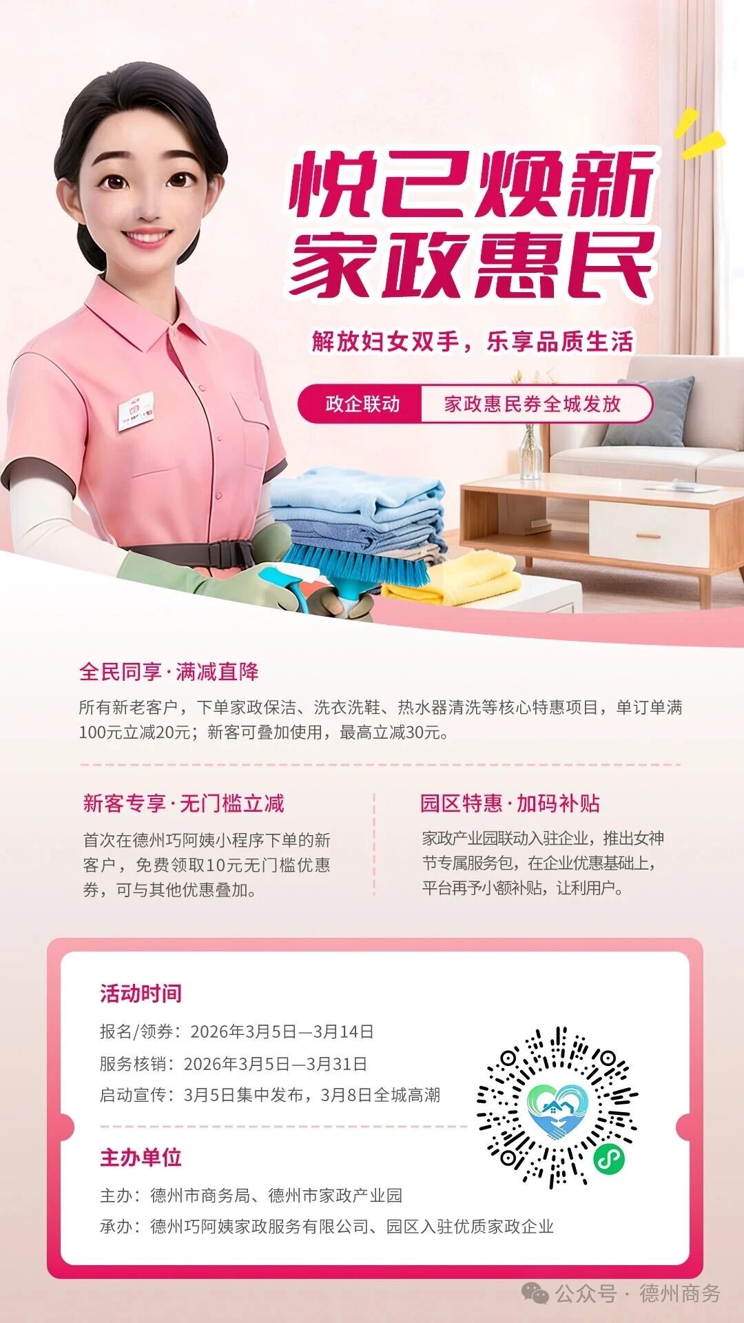 为切实提升女性生活品质,助力女性灵活就业,近日,德州市商务局、德州市家政产业园联合德州巧阿姨等多家优质家政企业,正式推出“悦己焕新·家政惠民”3·8家政惠民主题活动。此次政企联动的惠民活动,通过企业让利、公益服务、就业帮扶等多重举措,让德州女性解放双手乐享生活,同时为女性就业创业搭建优质平台。