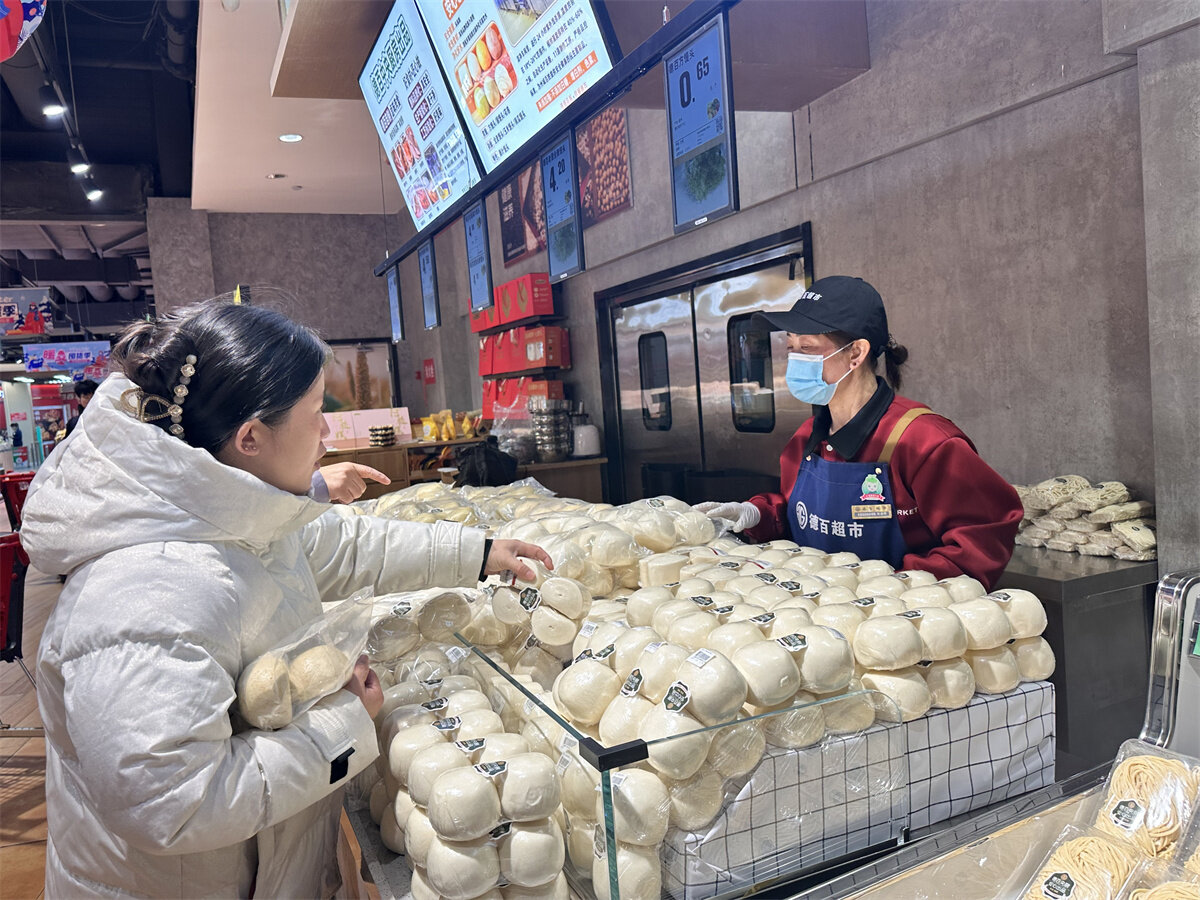 在澳德乐时代广场负一层,标注着德百中央厨房出品的专柜前客流不断。市民手中挑选的馒头、面条,熟食区的猪蹄、鸡爪,还有蔬菜区的豆芽,均
