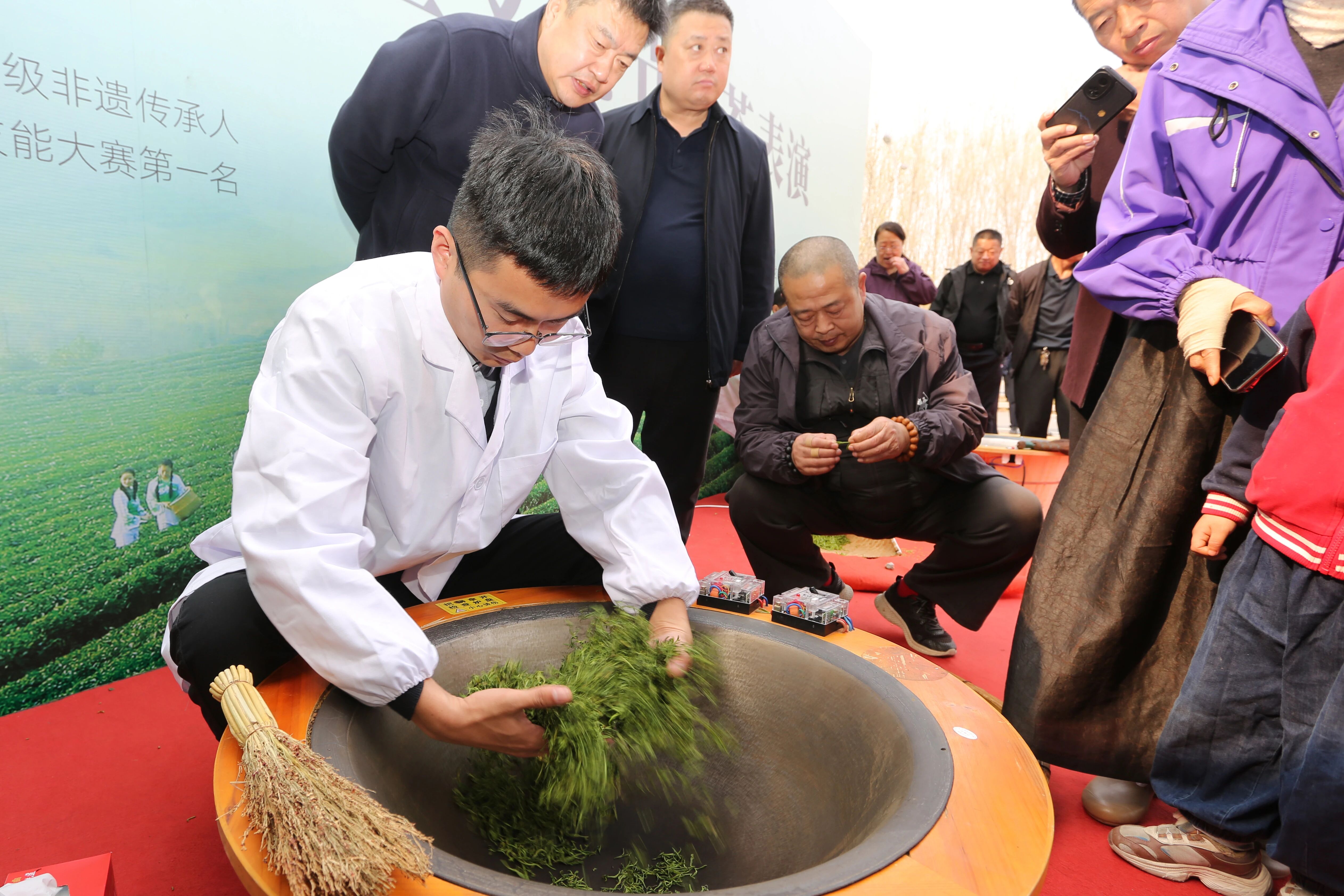 在沉浸式茶文化体验环节,高级技师孙云英、张浩现场演示明前茶手工炒制工艺,杀青、揉捻等工序行云流水,现场茶香四溢,让大家近距离感受非遗制茶的匠心与魅力。同时,旭日茶艺师团队带来专业的春茶冲泡表演与手工包茶展示,搭配悠扬的古琴演奏,一招一式尽显茶艺精髓。
