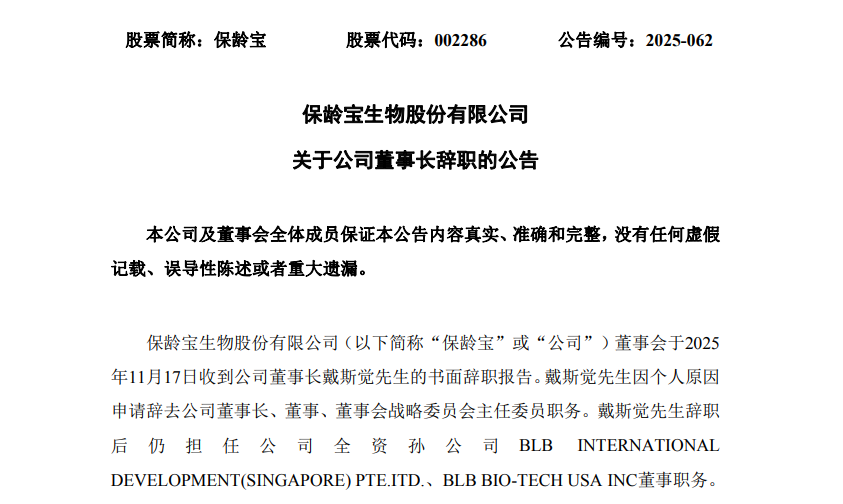 曾刷新A股最年轻董事长纪录 戴斯觉因个人原因辞任保龄宝