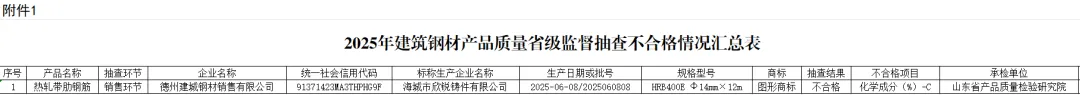 2025年建筑钢材产品质量省级监督抽查结果出炉,德州一家企业产品不合格