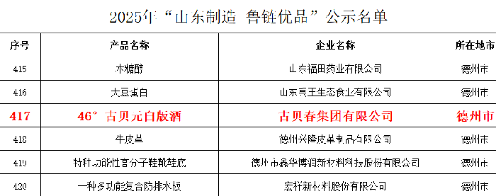 46度古贝元白版酒入选“山东制造·鲁链优品”